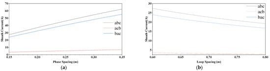 It can be seen from Figure 3 that the cable spacing D in Equation (5) is decided by phase spacing and loop spacing. Therefore, the circulating current is influenced by phase spacing and loop spacing. The influence is computed, as plotted in Figure 7. Here, parallel cables are under triangular horizontal arrangement and triangle vertical arrangement.