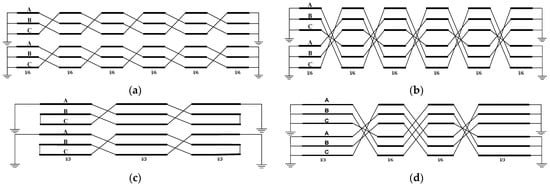 As show in Figure 5, the phase sequence of flat horizontal arrangement is ABC-cba; the flat vertical arrangement has two phase sequences, i.e., ABC-abc and ABC-cba; and the phase sequence of triangle horizontal arrangement is ABC-acb. All the double cable loops are symmetrical in space.