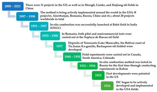 In 1932, A.B. Sheinman [,], the main proponent of thermal technologies in the development of oil fields, was the first to propose in situ coal gasification method. In 1934, he tested this method at the Sharkan underground oil field (Kuban, Russia) []. In addition, the in situ combustion method had been actively developed and implemented in US oil fields as early as in 1916. The first practices were patented in the United States in 1923, and in 1948, ten field experiments were carried out in different parts of the United States, Canada, and South America, including the Colorado oil shale []. About 230 pilot projects of in situ combustion were fulfilled in the US from 1950 to the end of the 20th century, of which 37 of them were technically and economically successful; however, more than 130 projects failed [].