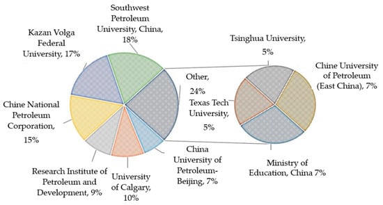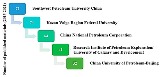 Figure 3 and Figure 4 show the leading research universities and organizations that have made the most considerable contributions to the study of this method. Southwest Petroleum University of China, Kazan (Volga Region) Federal University, and the National China Petroleum Corporation are at the top of this list (Figure 4).