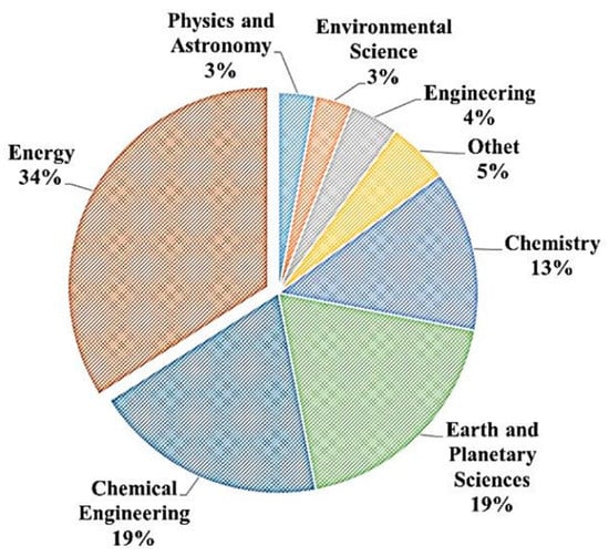 The analysis of the research area shows that the main purpose of research is to gain new knowledge in the field of energy (34%). It also shows that the in situ combustion method is necessary for oil extraction, which is the paramount for developing world energy. Receiving actual data on the geological study of heavy and extra-heavy oil field locations and into the effects of parent rock on the in situ combustion processes (as well as the basic characteristics of crude hydrocarbons) would allow us to identify the possibilities of using this method most effectively. Based on this fact, the sciences related to geology, planets, and the environment, are still in a challenging scientific search (Figure 5).