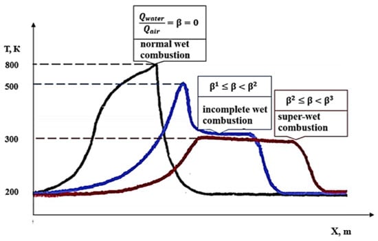 During the numerous tests, it was found that in situ combustion can be made more efficient by supplying water with the oxidizer, which affects the temperature distribution in the reservoir and changes the intensity of chemical reactions. These changes are caused by the fact that the greater the amount of water, the more significantly does the velocity of the heat wave in the convective front increase. That is, the more water is supplied, the higher the wave velocity, which becomes equal to the combustion front propagation rate, i.e., the heat wave inversion occurs [,,,]. As noted in the study by Jacques et al. [], three basic types of the processes (corresponding to increasing the water–air ratio) can be distinguished: normal wet combustion, incomplete wet combustion, and superwet combustion, as shown in the diagram below, along with the main temperature parameters of these types (Figure 6).
