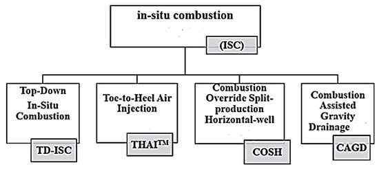 There are several technologies for implementing the in situ combustion method, which differ from each other structurally and by their main approaches to forming the combustion front area. A diagram of the main existing technologies is shown in Figure 7.
