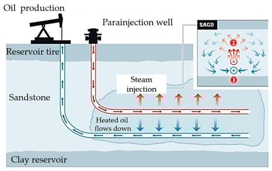 Recently, special attention has been paid to the technology of the thermogravitational drainage of oil reservoirs, a process called Steam Assisted Gravity Drainage (SAGD), which is also used in fields with very viscous oil, helping to “warm up” the reservoir and cause the oil to come out faster. Depending on the relative position of the injection and production wells, SAGD can be one of two types: ‘classic’ and counter SAGD. In the classic method, both wells are drilled from the same well pad, and the injection well is located approximately 5 m higher than the production well. Steam is then supplied to the injection well under pressure, and the heated oil with light fractions under the effect of gravity descends into the horizon of the production wellbore. A schematic diagram of the implementation of SAGD technology is shown in Figure 8 [,].