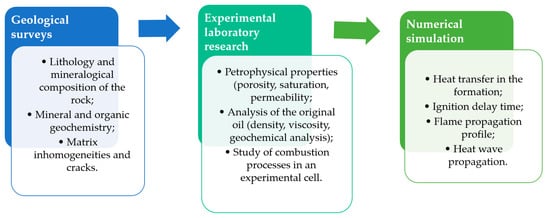 To define the range of key parameter values and eliminate errors, it is necessary to conduct a series of numerical and experimental studies before launching the projects. Particular attention should be paid to the experimental part since the primary data that will allow for understanding the specifics of both the deposit and the initial raw hydrocarbon are produced in the course of laboratory studies. This will facilitate the evaluation of the possibility for an effective practical application of the in situ combustion method in the field. Ultimately, the knowledge gained can be backed up using numerical simulation, and only then will one be able to proceed to the development of a field for producing viscous and ultraviscous oil, considering all the individual characteristics of both the very method and the heterogeneous structure of the formation. Based on the above, a typical diagram illustrating the research involved in designing in situ combustion is shown in Figure 9, comprising the following main blocks: geological surveys, experimental laboratory research, and numerical simulation.