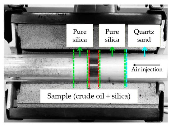 In general, the extraction of viscous and superviscous oil using the in situ combustion method depends on the interaction between the hydrocarbons in the oil reservoir and oxygen in the air, which produces a large amount of heat. This heat accumulates in the vicinity of the moving combustion front. At the same time, the combustion is sustained by a part of the oil in the reservoir, which accumulates due to its displacement by combustion gases, water vapor, vaporized oil fractions in front of the combustion front, and changes because of distillation, cracking, and other complex chemical processes [,,,,,]. Some processes are characterized by their complex nature, which makes obtaining relevant scientific knowledge quite challenging.