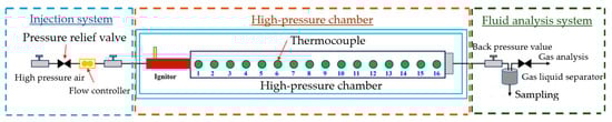 The experimental setup consisted of a one-dimensional combustion pipe, an igniter, an injection system, a fluid analysis system, and a data collection system. The length and diameter of the combustion pipe were 72 and 7.5 cm, respectively. To register the temperature, 16 thermocouples were installed along the pipe (Figure 12).
