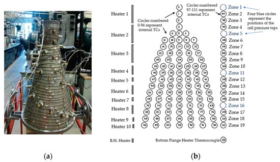 The diagram of the conical combustion cell unit (a), radial position of internal and wall thermocouple elements, pressure taps, and zone heaters (b) [].