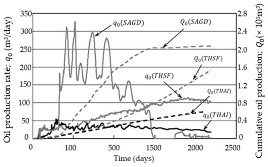 Latterly, Petrobank Energy and Resources Ltd. have patented the THAI technology, which facilitate the formation of an inclined (horizontal) combustion front using a complex system of well arrangement. Injection wells must be positioned so that the combustion front advances from top downward to the producing well, due to gravitational and capillary forces required to stabilize it [,]. This technology was implemented in the context of the Whitesands project. According to the data, the oil recovery factor was 70–80%, but in fact it was much less, amounting to about 55%. The laboratory studies have shown that THAI increases the oil API by 10°, and during the combustion process the quality of the extracted oil gets partially better. It should be noted that there are some limits for the reservoir depth (which should be at least 100 m and no more than 500 m), and the thickness of the reservoir should vary from 12 to 45 m [,].