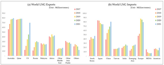 In 2021, global LNG trading volume amounted to 379 million tons. Australia is currently the world’s largest LNG exporter, producing approximately 80 million tons of LNG annually. Australia is followed by Qatar and the United States as the world’s second and third largest LNG exporters, respectively. The Asia–Pacific region is a major LNG consumer, importing and consuming approximately 72% of the global production. China and Japan are the world’s first and second largest LNG importers, importing approximately 81 million tons and 75 million tons annually, respectively. Korea is the third largest LNG importer, importing approximately 45 million tons annually [2]. Russia was the fourth-largest exporter of LNG in 2021, and currently holds a prominent position as a significant supplier of LNG in the global gas market [2]. However, in 2022, Russia’s LNG export capacity dropped to sixth place [3]. This decline can be attributed to disruptions in the supply of Russian gas resulting from the ongoing conflict between Russia and Ukraine. In the event of disruptions to the supply of Russian gas or sustained boycotts by gas-consuming countries of Russian gas, the international gas market will likely be adversely affected. Figure 1 shows a graph of the global LNG export and import trends, as illustrated with publicly open data from BP [2].