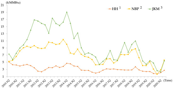 Historical trends of JKM, HH, NBP for ten years. 1 HH: henry hub. 2 NBP: national balancing point. 3 JKM: Japan Korea marker.