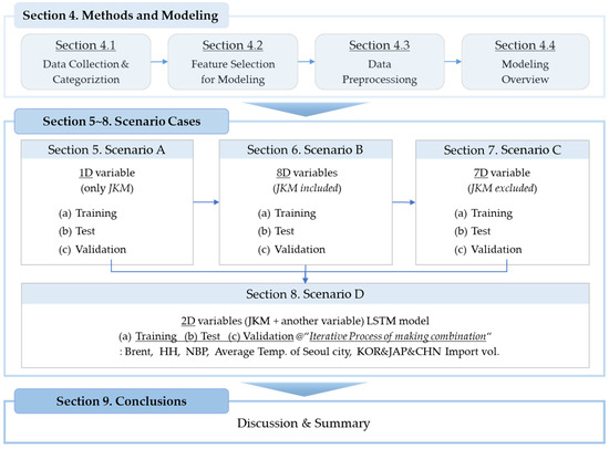 This paper consists of 10 sections. Section 1 describes the LNG market’s characteristics and trends, as well as the study’s necessity and purpose. Section 2 analyzes research conducted on crude oil and NG price prediction using ML techniques, as well as studies applying ML prediction techniques to stocks, virtual currencies, and exchange rates. Additionally, it examines prior research using traditional prediction techniques for time series data. Section 3 describes this study’s scope and framework. Section 4 presents an overview of the methods and modeling and explains the collection of data used in JKM prediction, feature selection, preprocessing, and modeling. Section 5, Section 6, Section 7 and Section 8, which are the most important parts of this paper, analyze the training and testing process and present the results of predicting JKM through a scenario analysis using the developed ML models. Section 9 summarizes the results of this study and their major implications. Finally, Section 10 analyzes the limitations of this study and concludes the article with suggestions for future research to improve the performance of the models.