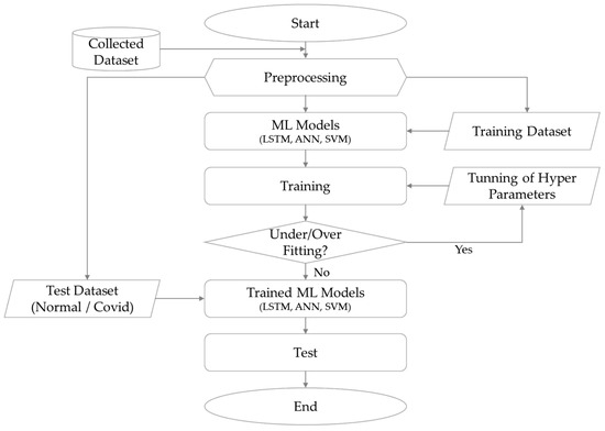 Based on the ML models using various algorithms, it is necessary to appropriately classify the dataset according to the purpose of selecting the optimal model and verifying its performance. In a data-rich situation, the best approach is to randomly classify the preprocessed data into training, validation, and test sets. The training set was used to fit the model, the validation set was used to measure performance (estimate prediction error) for selecting the optimal model, and the test set was used to measure the generalization error of the selected optimal model [57].
