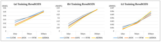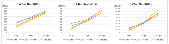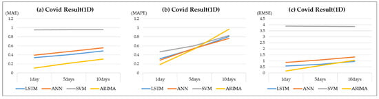 The COVID test results of scenario D—graph. (a) MAE resulting from application of two-dimensional variables. (b) MAPE resulting from application of two-dimensional variables. (c) RMSE resulting from application of two-dimensional variables.