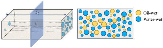 The porous media effective permeability model that has been established in this paper on the basis of fractal theory and capillary bundle theory has transformed the pore radius of the traditional fractal permeability model to the saturation of the capillary pressure curve. That could be calculated directly by the saturation to avoid the transformation process of the traditional method. The oil and water occurrence states in the two-phase capillary bundle model are depicted in Figure 2. It is assumed that both oil-wet and water-wet capillaries are contained in the tight core, which is affected by the boundary layer, and that the variation in their ratios is caused by changes in wettability. This will affect the characteristics of the two-phase relative permeability.