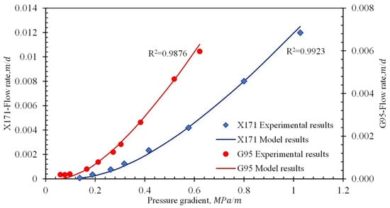 The results from the proposed model in this paper were compared with the nonlinear seepage experiment by Li Yongshou to verify their feasibility [43]. The experiment data from cores X191 and G95 were chosen for the calculation. The basic parameters are shown in Table 1, which includes the capillary pressure curve, as shown in Figure 3, and the model verification results are shown in Figure 4. It is seen from the results that the model in this paper can accurately characterize the nonlinear seepage characteristics in porous media.