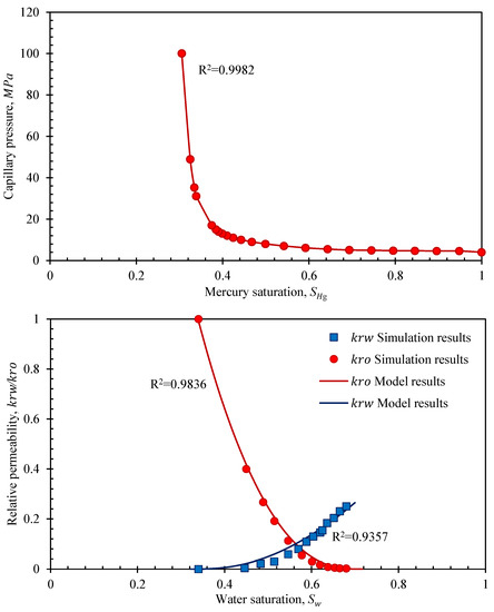 - Oostrom, R. A parametric model for predicting relative permeability-saturation-capillary pressure relationships of oil-water systems in porous media with mixed wettability. Transp. Porous Media 1998, 31, 109–131. [Google Scholar]
