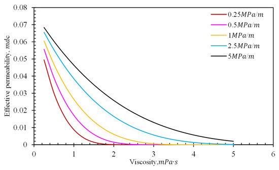 The influence of reservoir fluid viscosity on the effective permeability of porous media is shown in Figure 7. As the fluid viscosity increases, the effective permeability gradually decreases until it reaches 0 under the same pressure gradient, because as fluid viscosity increases, the thickness of the boundary layer and the ratio of immobile fluid in the micro- or nanopore also increase, as can be seen in Equation (2). This results in greater flow resistance and a significant decrease in permeability at the macroscopic scale.