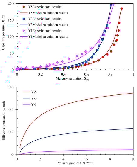 In order to discuss the influence of capillary radius distribution on permeability, it is necessary to select representative capillary pressure curves for the model calculations. From the results of high-pressure mercury injection experiments, Huang Xing divided the tight sandstone samples of the Chang 8 reservoir into three types, with different permeabilities and displacement pressures [45]. The parameters used in the calculation are shown in Table 3, and the variations in capillary pressure and effective permeability are presented in Figure 8. As the capillary pressure increases, the pore radius decreases and the fractal dimension of the tortuosity increases. Furthermore, the pore fractal dimension gradually decreases, and this indicates that the pore-throat tortuosity is greater in rock cores with poor physical properties. According to the calculation, as the physical properties of the pore throats deteriorate, the throats become smaller, the displacement pressure increases, and the influence of the boundary layer becomes more significant, resulting in a significant decrease in effective permeability (Y1 < Y3 < Y5).