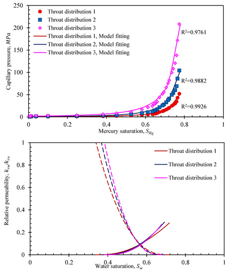Fitting of capillary pressure curves for different types of pore-throat distribution and their relative permeabilities.