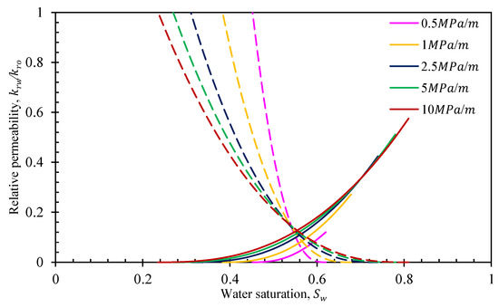 Figure 10 shows the effect of pressure gradient on the shape of the relative permeability curve. With increasing pressure gradient, both residual saturations of the nonwetting and wetting phases decrease, the two-phase c-infiltration zone extends, and the wetting-phase saturation increases at the residual nonwetting-phase saturation. Under the same saturation of the wetting phase, the relative permeability of the nonwetting phase decreases and the relative permeability of the wetting phase increases. This is because as the pressure gradient increases, the thickness of the boundary layer and the seepage resistance decrease. With further increases in the pressure gradient, the thickness of the boundary layer gradually tends to become stable, and the relative permeability curves gradually tend to coincide.