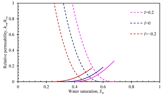 It can be seen from Equations (17) to (19) that the wetting phase relative permeability is 1 at the nonwetting-phase saturation in this model, which is inconsistent with the actual oil–water two-phase relative permeability curve. The reason is that when the nonwetting phase initially saturates the porous media, the total seepage process can be considered as single-phase seepage; therefore, the relative permeability of the nonwetting phase at the residual wetting-phase saturation is equal to 1. However, as the wetting-phase saturation increases, the nonwetting phase becomes a discontinuous fluid. Part of the nonwetting-phase fluid cannot be displaced and stays in the core, which hinders the seepage process of the wetting-phase fluid, and the relative permeability of the end point cannot increase to 1, which means there is a loss in permeability. When the permeability loss in during two-phase seepage is considered, the relative permeability of the oil–water two-phase process can be expressed as follows: