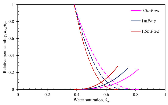Figure 12 shows the influence of the viscosity on the relative permeability. An increase in the viscosity of the oil phase leads to a rapid increase in the residual oil saturation, a reduction in the copermeability zone, the relative permeability of the water phase at the residual oil saturation, and the gradual shift of the isotonic point to the right. This is because as the viscosity of the oil phase increases, the thickness of the oil-phase boundary layer increases, resulting in seepage resistance and an increase in the proportion of immovable oil in the pores. The residual oil saturation increases as well, which also gives reasons why the coseepage region for oil–water two-phase flow in tight reservoirs is smaller than that in other conventional reservoirs. Moreover, under a given wettability situation, the ratio of pores for oil-phase and water-phase flow is fixed. The thickness of the water-phase boundary layer would not change with the reduction in the oil-phase seepage capability; therefore, the water phase’s relative permeability would increase at the residual oil saturation.
