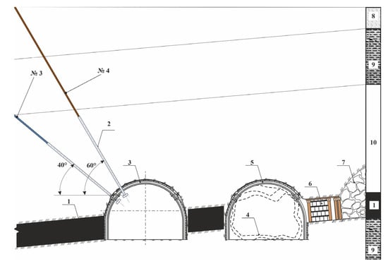 Location of wells N° 3 and N° 4 in the mine site: 1—coal seam; 2—well casing; 3—air roadway 18th eastern longwall; 4—roadway deformations; 5—haul roadway 17th eastern longwall; 6—lining; 7—goaf; 8—sandstone; 9—aleurolite; 10—claystone.