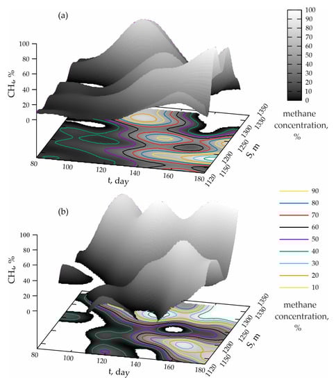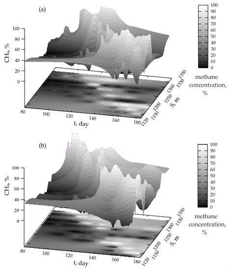 Proceeding from the experience of practical working in mine conditions allows for concluding that the quality of the normative forecast turned out to remain low. In most scientific works, two-dimensional curves or their aggregates in the form of projections on a two-dimensional plane are mainly considered [,,,]. For example, a two-dimensional curve characterized by the relationship between the methane concentration and distance S at different times, as well as the methane concentration change over time at different positions, is insufficiently representative (see Figure 2 in []) owing to the deformation of a three-dimensional surface when it is projected onto a two-dimensional plane. This conceptual imperfection in the methodological approach does not allow for adequately interpreting the obtained results, not to mention the formation of universal conclusions and generalized regularities. The general formulation of the problem even in the presence of the initial spatial limitation on the number of dimensions (first instead of third) is reflected insignificantly. Along with the previous studies, CH4 (the methane concentration in the mouth of underground wells under constant vacuum pressure) as a function of the response from S (distance from the wellhead to the beginning of the panel during its development by reverse stroke—the “space” factor limited by the first dimension) is considered. There is also t (the time of making the measurement), SL (the position of the face relative to the panel beginning), and St (the time at which the face occupies a certain position relative to the panel beginning). The above-mentioned show that this is a five-dimensional task, which, at best, is more correctly displayed by a set of four-dimensional ones. The previous studies made it possible to find approaches to how to lower the dimension during the transition from SL–St to L []. This substantially facilitated approaches to identifying the interrelation of the effect of the remoteness from lava on gas flows. In this paper, an attempt was made to establish the inverse problem, which is the impossibility of considering gas flows without the “lava component”, which gradually transforms their dynamics (if we consider the dynamics separately from lava)—“lava influence profile”. In this regard, for the first time, when a four-dimensional space–time problem was considered limitedly (that is, without L in the CH4–t plane), according to the planned approach, the parameter S was introduced. This made it possible to consider the process under study as a function (given in the implicit form) of CH4 of S (the space axes—distance from the beginning of the site “by analogy with the distance from the beginning of the site to the position of the lava in other moments of time”), t (measurement time).