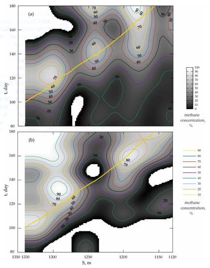 Dynamics of methane emission in “space–time” coordinates based on primary information: (a) and (b)—wells N° 3 and N° 4, respectively.