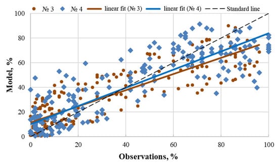 In addition, from Figure 5, it is obvious that the model data for well #4 have minimal deviations from the black line, and the angle of slope of the blue line is slightly less than for well #3 (which can be explained by the difference in sample volumes for the studied datasets). The linear trend equation has the following form (R2 = 0.76):