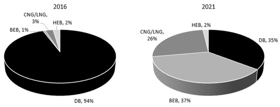 Share of particular types of city buses among new city buses purchased in Poland in 2016 and 2021. Source: Own elaboration based on [37,40,41].