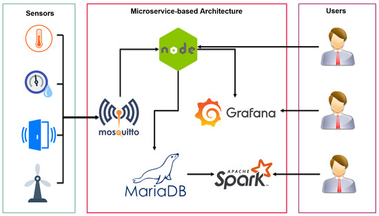 However, as said before, container-based virtualization brings many more benefits than hypervisor-based virtualization for microservice architectures, since they can deploy software applications as packets of modular and independent microservices, being much lighter, easier to maintain, and achieving better performance [38]. Each microservice is a container that has its own programming language, data storage, and communication mechanisms. Container-based virtualization has had a huge impact on microservice architectures, especially in IIoT applications that perform complex and new functionalities. In this kind of system, a flexible and agile deployment, as well as an efficiency of resources, is needed. In addition, these systems tend to be very volatile, so good scalability is also an important factor. In Figure 4, an example of a microservice architecture for IoT is shown. As is shown, the different microservices interact, in order to fulfill their purposes (collect data from different sensors, store them in a database, and offer different analysis and visualization techniques to external users). Each microservice is in charge of a task and communicates with the others independently. Microservices can range from managing a database to training machine learning algorithms.