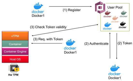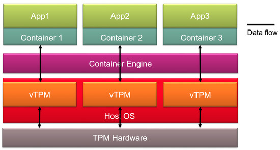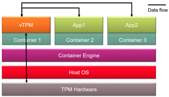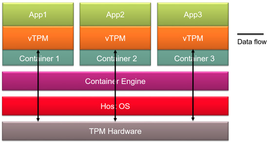 Figure 5 presents a first approach to combining TPMs with microservices [33]. In this approach, each microservice making use of the TPM has a vTPM in the container. Therefore, in this approach, the size of the containers may grow considerably, becoming more heavy and less flexible than other proposals.