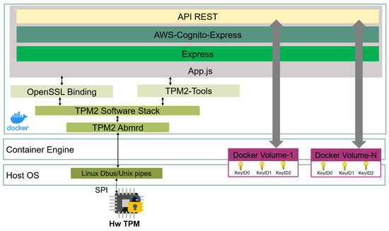 Instead, this type of solution allows for the possibility of abstracting the software-level functionality of the TPM. The software implemented by the microservice and making use of the TPM is independent and does not have to comply with any standard to make use of the TPM. This is a differentiating element from the traditional use of TPM by external applications, since there are software standards that are used to manage a TPM as if it were a hardware token, as in the case of PKCS11 [60]. This standard defines an API in order to interact with the TPM through external applications.