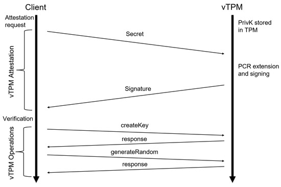 Figure 10 shows the process that allows a client container to perform the attestation and subsequent verification. If this verification is satisfactory, the client container will perform operations that it deems appropriate on this container, such as the creation of keys or obtaining random numbers. In this way, by making sure that the state of the vTPM container is correct, the client knows that the operations performed on it are reliable.