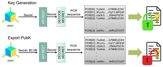 TPM2.0 provides mechanisms to carry out this functionality. Moreover, during the execution time, it can perform measurements of different elements of the operating system and the rest of the software, to check the status of these components. These measurements are stored in special TPM registers called platform configuration registers (PCRs) [51]. Depending on the value of these registers, the TPM will unlock the information required by the client microservice (the generation of a signature or the use of a private key). The PCRs are used both for the request that a microservice makes when using the TPM and for unsealing the data contained in the TPM measuring the state of the container during execution. The first is known as attestation of the container by the TPM, and the second is known as the sealing process.
