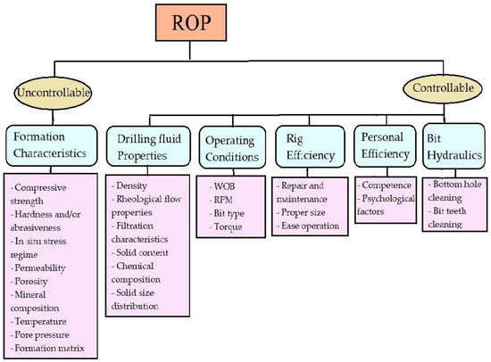 From the mathematical perspective, the ROP is defined as the ratio of the rock’s drilled length to the drilling time. The ROP can be affected by a wide spectrum of miscellaneous factors [3]. Those factors are classified as the controllable and uncontrollable factors. The adjustable factors, e.g., revolutions per minute (RPM), mud-flow rate (Q), torque (T), and weight on bit (WOB), can be changed and controlled by the operators [4]. By contrast, some other factors cannot be changed due to technological limitations, or geological conditions. For instance, wellbore trajectory, pore pressure, rock strength, and equivalent circulation density (ECD), are examples of uncontrollable factors [5].