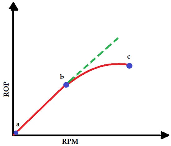 Regarding the RPM, Figure 3 illustrates the relation between the RPM and the ROP (red curve). For the low values of RPM (segment ab), there is a direct, linear relationship between the RPM and the ROP. The green dashed line illustrates such linear relation. Point b is known as the foundering point. After point b, the rise in the RPM causes a nonlinear increase in the ROP with a slower pace (segment bc). Such reduction is due to the inefficient bottom-hole cleaning and mud characteristics, such as buoyancy factor [59].