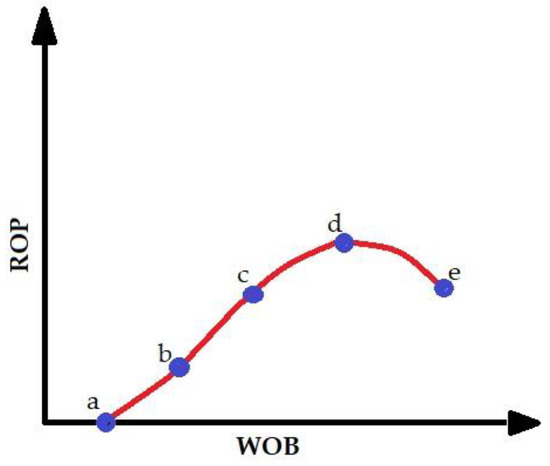 Regarding the WOB, Figure 4 depicts the change of the ROP versus the WOB (red curve). Note that no tooth wear is assumed in this figure. Point a is known as the threshold formation stress. Before point a is surpassed, no substantial penetration rate is obtained. For the low values of bit weight (segment ab), the ROP builds up linearly with rising values. The moment at which the rock-failure condition switches from scraping to shearing is known as point b. After point b, as the WOB increases, the ROP heightens linearly (segment bc); however, this segment has a steeper slope than the segment ab, thereby indicating a higher drilling efficiency. Beyond point c, additional bit weight enhances the ROP marginally (segment cd). Point d is the foundering point. After point d, in some instances, the ROP drops off at excessively large WOB values (segment de). The reason is that for the intensely high WOBs, the bottom-hole cleaning and cutting removal mechanisms become inefficient due to the large volume of rock cuttings produced in the bottom-hole. Such a situation also prevents the mud from escaping from the nuzzles, thereby leading to further inefficient bottom-hole cleaning [37,59].