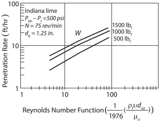 where N R e stands for the Reynolds number function, K s represents the scaling coefficient, ρ f (Ib/gal) indicates the density of mud, Q (gal/min) represents the fluid-flow rate, d n z (in) indicates the diameter of nozzle, and μ a (cp)) represents the mud’s apparent viscosity at 104 s−1. Figure 5 displays the impact of the Reynolds number function and WOB on the ROP [18]. For the whole range of the Reynolds numbers investigated, the penetration rate rises as the Reynolds number function increases. As it can be observed, the corresponding curve moves upward as the WOB is raised. It is noteworthy that Eckle did not investigate the effect of the foundering point on the ROP.