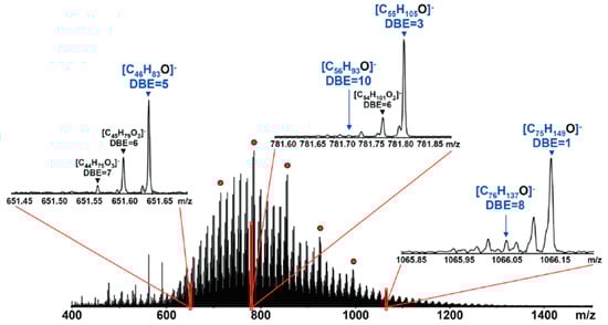 Broadband negative-ion ESI FT-ICR mass spectrum of the O1 species in the product of the RICO of saturate fraction of Dagang vacuum residue. The insert shows the expanded mass scale spectrum at m/z 651, 781, and 1065. The peaks marked with an asterisk are highly abundant compared to the adjacent peaks. DBE values were calculated for the neutral states of the compounds. Reprinted with permission from Ref. [63]; Copyright 2012, American Chemical Society.