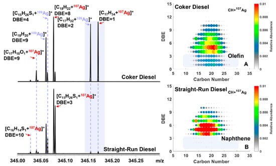 Expanded Ag+ complexation (+) ESI HR mass spectra and the plots of [CH + 107Ag]+ DBE versus carbon number for coker diesel (A) and straight-run diesel (B). The color represents the relative abundance percentage of the sum of [CH + 107Ag]+ and [CH + 109Ag]+ peaks. Reprinted with permission from Ref. [69]; Copyright 2022, Elsevier.