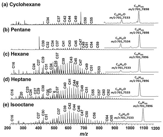 APCI (+) FT-ICR mass spectra for paraffin B at 0.5 mg mL−1 using different aliphatic solvents as APCI reagent. Reprint with permission from Ref. [76]; Copyright 2015, Elsevier.