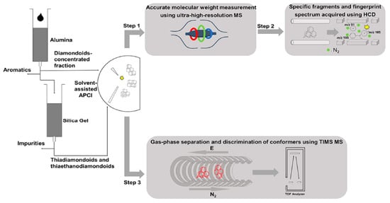 Workflow of the multi-dimensional mass spectrometry (MS) strategy. Step 1: Determination of the accurate molecular weight and molecular composition using solvent-assisted atmospheric pressure chemical ionization (APCI)-ultrahigh-resolution MS. Step 2: Structural identification by analyzing the specific fragments and fingerprint spectral profiles using high-energy collision dissociation (HCD). Step 3: Differentiation and identification of the conformational isomers using trapped ion mobility spectrometry MS (TIMS-MS). Reprinted with permission from Ref. [80]; Copyright 2023, Elsevier.