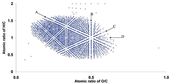 The van Krevelen plot for elemental data calculated from the ultrahigh-resolution mass spectrum of McDonalds Branch DOM. Distinctive lines in the plot representing chemical reactions are noted as: (A) methylation, demethylation, or alkyl chain elongation; (B) hydrogenation or dehydrogenation; (C) hydration or condensation; and (D) oxidation or reduction. Reprinted with permission from Ref. [85]; Copyright 2003, American Chemical Society.