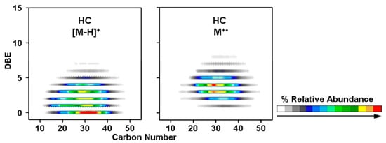 Here, we first introduce the method of interpreting the DBE versus carbon number plot. In the plot, the abscissa represents the distribution of carbon number, and the ordinate represents the number of equivalent double bonds. The size of the dots in the plot represents the relative abundance of the compound, with larger dots indicating a higher relative abundance of the compound in the sample. Figure 6 is the DBE versus carbon number plot of saturated hydrocarbons in raw oil (using complex saturated hydrocarbon mixture simulation). In this work, straight-chain alkanes and branched alkanes are mainly ionized into [M − H]+, and cycloalkanes are ionized into [M − H]+ and M+• depending on the capillary temperature. In this simulated raw oil, the carbon number of alkanes represented by DBE = 0 is about C10~C50, and the abundance of alkanes with carbon number distribution between C28~C36 is higher (Figure 6, left). The graph also shows higher DBE series corresponding to cycloalkanes with increasing ring numbers (from one to eight rings). At a heated metal capillary temperature of ~250 °C, cycloalkanes also generate radical cations, as shown by an isoabundance-contoured plot of DBE versus carbon number (Figure 6, right). High-abundance species with carbon number C27−C30 and DBE = 4 likely represent C27−C30 steranes, in agreement with GC/EIMS, GC × GC, and FIMS biomarker analysis of similar mixtures [87].