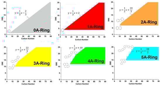 The identification of molecular structures of hydrocarbon compounds is essential for petroleum analysis. Nowadays, DBE versus carbon number plot has become the most widely used data processing method for hydrocarbon analysis in petroleomics. However, hydrocarbon compounds in crude oil exhibit continuous DBE distribution. Therefore, it is difficult to identify hydrocarbon structures merely by DBE value. For example, hydrocarbons with DBE = 4, 7, and 10 are usually considered aromatic hydrocarbons with 1, 2, and 3 aromatic rings, respectively [88,89]. However, this judgment ignores the contribution of cycloalkanes to the DBE values, and those with a DBE of 4 may also be tetracyclic cycloalkanes (steranes). The concept of planar limits was proposed by Cho et al. to explain the type of molecular structure in crude oil based on the DBE versus carbon number plot [90]. The planar limit was defined as the line formed by connecting the maximum DBE at each carbon number in the DBE versus carbon number plot. The slope and intercept of planar limits were related to the addition of functional groups and core structure, respectively. This method can analyze the overall structural characteristics of saturated hydrocarbon/aromatic/resin/asphaltic (SARA) fractions but cannot accurately infer the structure of individual molecular formulae. Based on this idea, a DBE linear equation describing the structure of petroleum hydrocarbons was proposed by Dong et al. It is divided into alkyl, naphthenic, and aromatic homologous equations based on the magnitude of the slope. The structure of any petroleum hydrocarbon can be represented by a combination of these three types of DBE linear equations, and the distribution map of aromatic hydrocarbons was constructed based on the DBE linear equation to visualize the ring structure of petroleum hydrocarbons. The experimental results of UHRMS validate the feasibility of the distribution map to distinguish naphthenic and aromatic rings and to classify the numbers of aromatic rings. This method provides a new idea for the determination and identification of petroleum hydrocarbon structures in complex petroleum samples (Figure 7) [79]. Due to the limitation of instruments and technology, the data analysis methods for hydrocarbon compounds in petroleum by UHRMS are still relatively limited. However, we believe that with the development of new MS and the modification of ionization technology, the data analysis methods for hydrocarbon compounds will also become more and more advanced.