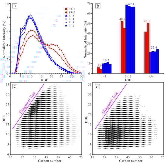 (a) Double bond equivalent (DBE) distributions of hydrocarbon (HC) in the two source rock (SR-1 and SR-2) extracts (red) and four fluid inclusion (FI-3 to FI6) oils (blue). (b) Normalized intensity of the low (DBE1–5), medium (DBE6–15), and high (DBE15+) DBE groups of HCs in the SR extracts (red) and FI oils (blue) with numbers indicating average values. (c) DBE versus carbon number plot of HCs in a representative SR extract (SR-2). (d) DBE versus carbon number plot of HCs in a representative FI oil (FI-6). The normalized intensity (%) is expressed relative to the total monoisotopic ion abundance of the HC class. The magenta-colored diagonal line delineates the minimum carbon number of a non-alkylated planar polycyclic aromatic core molecule within every DBE class. Reprinted with permission from Ref. [92]; Copyright 2022, Elsevier.