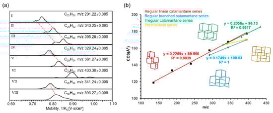 Analysis of the diamondoids present in the ZS1C crude oil using TIMS-MS as the illustration of the third dimensional MS characterization method: (a) Extracted ion mobiligrams recorded for unsubstituted diamondoids belonging to different series. (b) Linearity between the collision cross-section (CCS) values and m/z values of the unsubstituted diamondoids with varying molecular weights, structures, and conformations. Reprinted with permission from Ref. [80]; Copyright 2023, Elsevier.